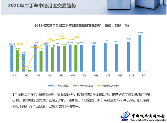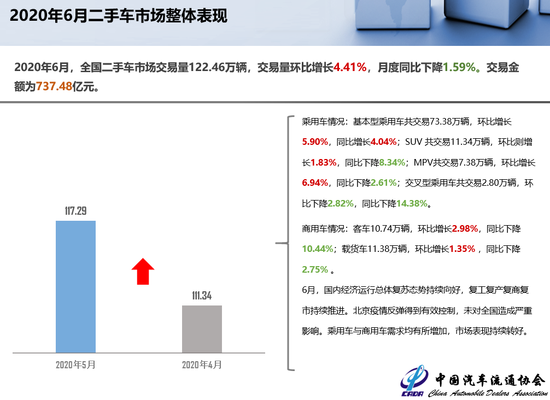 2020年6月,全國(guó)二手車市場(chǎng)交易量122.46萬(wàn)輛,交易量環(huán)比增長(zhǎng)4.41%,月度同比下降1.59%。交易金額為737.48億元。