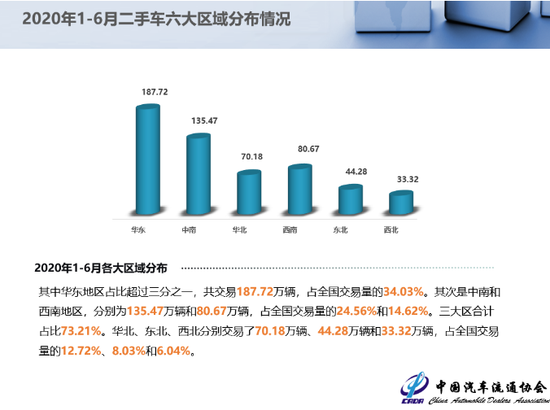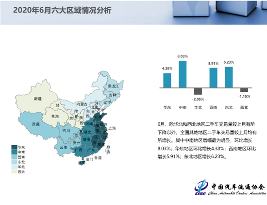 6月,除華北和西北地區(qū)二手車交易量較上月有所下降以外,全國(guó)其他地區(qū)二手車交易量較上月均有所增長(zhǎng)。其中中南地區(qū)增幅最為明顯,環(huán)比增長(zhǎng)8.03%;華東地區(qū)環(huán)比增長(zhǎng)4.38%;西南地區(qū)環(huán)比增長(zhǎng)5.91%;東北地區(qū)增長(zhǎng)6.23%。