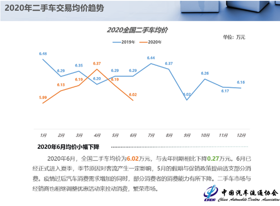 2020年6月,全國(guó)二手車均價(jià)為6.02萬(wàn)元,與去年同期相比下降0.27萬(wàn)元。6月已經(jīng)正式進(jìn)入夏季,季節(jié)原因?qū)土鳟a(chǎn)生一定影響,5月的假期與促銷政策提前透支部分消費(fèi)。