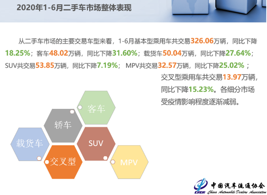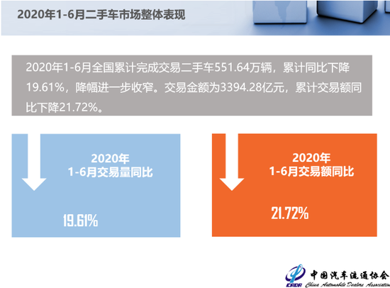 2020年1-6月全國(guó)累計(jì)完成交易二手車551.64萬(wàn)輛,累計(jì)同比下降19.61%,降幅進(jìn)一步收窄。交易金額為3394.28億元,累計(jì)交易額同比下降21.72%。