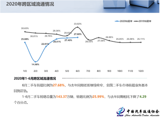 6月二手車轉(zhuǎn)籍比例為27.68%,與去年同期差距繼續(xù)收窄,全國(guó)二手車市場(chǎng)轉(zhuǎn)籍業(yè)務(wù)基本回到正軌。1-6月二手車轉(zhuǎn)籍總量為143.37萬(wàn)輛,轉(zhuǎn)籍比例為25.99%,與去年同期相比下降了4.29個(gè)百分點(diǎn)。