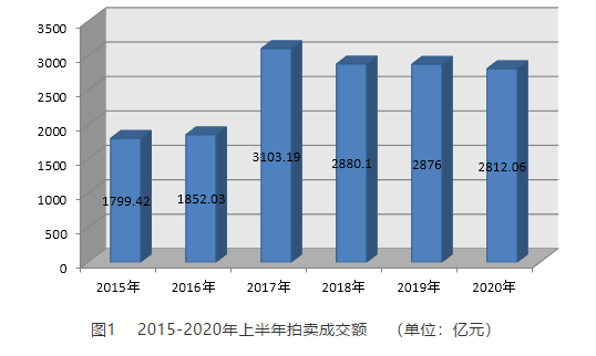 據(jù)商務(wù)部“全國拍賣統(tǒng)一業(yè)務(wù)平臺(tái)”統(tǒng)計(jì),上半年1-6月份,拍賣總成交額2812.06億元,同比下降2.22%(見圖1)。上半年,主要受到疫情的影響,全國各地拍賣活動(dòng)不同程度出現(xiàn)業(yè)務(wù)延遲或取消。其中,一季度,成交額879.86億元,同比下降22.86%,環(huán)比上年四季度降幅66.6%;二季度得益于疫情有效控制和企業(yè)復(fù)工復(fù)拍節(jié)奏加快,成交額出現(xiàn)補(bǔ)漲,共成交1932.19億元,同比增長 11.34%,環(huán)比第一季度增幅高達(dá) 119.6%。