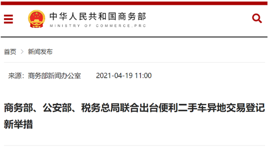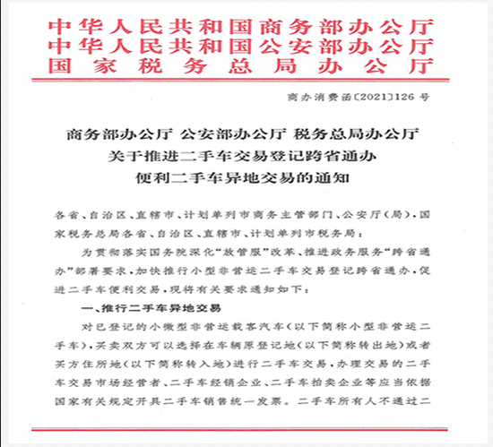 為貫徹落實(shí)國務(wù)院深化“放管服”改革、推進(jìn)政務(wù)服務(wù)“跨省通辦”部署要求,加快推行小型非營運(yùn)二手車交易登記跨省通辦,促進(jìn)二手車便利交易,加快形成二手車交易全國統(tǒng)一大市場(chǎng),近日,商務(wù)部、公安部、稅務(wù)總局聯(lián)合印發(fā)《關(guān)于推進(jìn)二手車交易登記跨省通辦 便利二手車異地交易的通知》(以下簡(jiǎn)稱《通知》),從制度方面著力解決二手車異地交易周期長、不便捷等問題,進(jìn)一步促進(jìn)二手車交易行業(yè)發(fā)展。