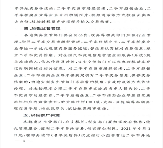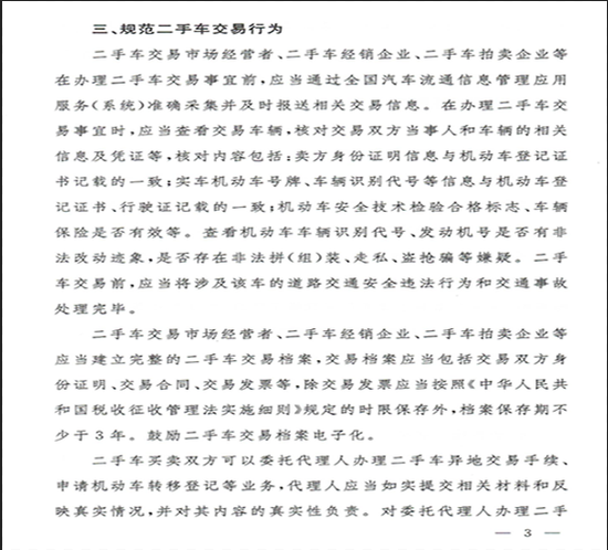 三是規(guī)范二手車交易行為。《通知》進(jìn)一步強(qiáng)化了經(jīng)營主體責(zé)任,確保交易安全,維護(hù)交易各方合法權(quán)益。要求二手車經(jīng)營主體在辦理二手車交易事宜前,應(yīng)當(dāng)通過全國汽車流通信息管理應(yīng)用服務(wù)(系統(tǒng))準(zhǔn)確采集并及時(shí)報(bào)送相關(guān)交易信息,核對(duì)二手車交易雙方當(dāng)事人和交易車輛的相關(guān)信息及憑證,建立完整的二手車交易檔案,并按照規(guī)定的時(shí)限保存。對(duì)二手車買賣雙方委托代理人辦理二手車異地交易手續(xù)提出了細(xì)化要求。
