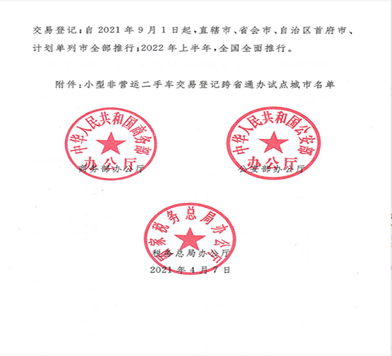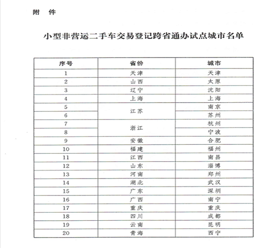 此外,《通知》對(duì)政策落地實(shí)施進(jìn)度做了具體部署,明確2021年6月1日起,在天津、太原、沈陽、上海等20個(gè)城市(名單見附件)試點(diǎn)推行小型非營運(yùn)二手車異地交易登記;自2021年9月1日起,直轄市、省會(huì)市、自治區(qū)首府市、計(jì)劃單列市全部推行;2022年全國全面推行。