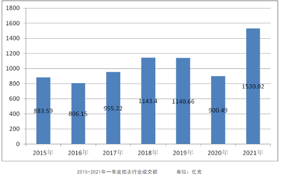 一季度我國大陸地區(qū)走出新冠疫情影響,經(jīng)濟(jì)穩(wěn)步增長(zhǎng),在此宏觀經(jīng)濟(jì)背景下,拍賣活動(dòng)異常活躍,拍賣行業(yè)繼續(xù)在成交額、成交場(chǎng)次、傭金收入、稅收繳納等方面實(shí)現(xiàn)大幅增長(zhǎng)。一季度全行業(yè)實(shí)現(xiàn)拍賣成交額1530.02億元,較2020年一季度成交額增長(zhǎng)629.53億元,增幅高達(dá)69.91%;較歷史同期最高的2018年一季度成交額增長(zhǎng)386.62億元,成為行業(yè)自2015年以來一個(gè)新的高峰(見圖1)。