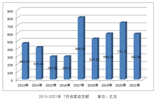 據(jù)“商務(wù)部業(yè)務(wù)系統(tǒng)統(tǒng)一平臺”統(tǒng)計,7月份全國拍賣企業(yè)拍賣成交場次8494場,較去年同期減少了482場,實現(xiàn)成交額587.81億元,同比下降19.67%(見圖)。