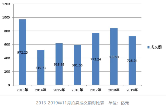 截至2019年11月底,全國(guó)31個(gè)省(區(qū)、市)及新疆生產(chǎn)建設(shè)兵團(tuán)共有拍賣企業(yè)7955家,比上年同期增加606家;有分支機(jī)構(gòu)250家,與上年持平。 據(jù)“商務(wù)部業(yè)務(wù)系統(tǒng)統(tǒng)一平臺(tái)”統(tǒng)計(jì),11月份全國(guó)拍賣企業(yè)拍賣成交場(chǎng)次8192場(chǎng),較2018年同期增加了2329場(chǎng),實(shí)現(xiàn)成交額725.94億元,同比下降 13.57%(見下圖)。