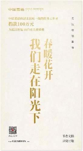 中國嘉德國際拍賣有限公司向湖北抗疫一線的醫(yī)務(wù)工作者捐款100萬元,為武漢祈福,向白衣天使致敬。舉辦藝術(shù)品義拍,籌得全部善款,捐贈(zèng)疫區(qū)前線,共克時(shí)艱。