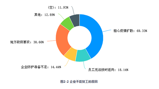 本次調(diào)研中,47.86%受訪企業(yè)表示已經(jīng)或?qū)⒃?0日前復(fù)工;21%計(jì)劃在2月21-29日期間復(fù)工;其余表示計(jì)劃在3月及以后復(fù)工。未復(fù)工的原因,主要是擔(dān)心疫情擴(kuò)散(69.33%)以及地方政府要求(38.66%);部分企業(yè)還存在因員工無法按時(shí)返崗(18.14%)和企業(yè)防護(hù)準(zhǔn)備不足(14.44%)而不能復(fù)工的情況。