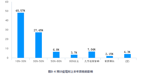 調(diào)研還顯示,48.57%的企業(yè)預(yù)計(jì)疫情對(duì)上半年?duì)I收的影響(占去年同期比重)為10%-30%;27.45%的企業(yè)預(yù)計(jì)有30%-50%的影響;6.8%的企業(yè)認(rèn)為在50%-80%之間;3.7%的企業(yè)認(rèn)為影響超過80%。四項(xiàng)合計(jì),受到負(fù)面影響的企業(yè)達(dá)86.52%。同時(shí),值得注意的是,從問卷抽樣看,同一企業(yè)經(jīng)營(yíng)者對(duì)上半年?duì)I收下降比例的判斷普遍大于1季度,說明企業(yè)經(jīng)營(yíng)者對(duì)疫情過后的業(yè)務(wù)恢復(fù)并不樂觀。