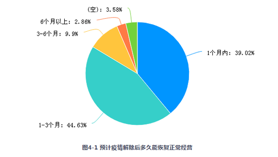 本次調(diào)研中,44.63%企業(yè)預(yù)計(jì)疫情解除1-3個(gè)月能恢復(fù)正常經(jīng)營(yíng);預(yù)計(jì)1個(gè)月內(nèi)能恢復(fù)正常經(jīng)營(yíng)的企業(yè)占39.02%,兩者合計(jì),在3個(gè)月內(nèi)預(yù)計(jì)能恢復(fù)正常經(jīng)營(yíng)的企業(yè)總共占比達(dá)到83.65%。