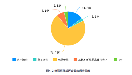 針對(duì)疫情解除后的困難,企業(yè)經(jīng)營(yíng)者最擔(dān)心的是拍賣市場(chǎng)萎縮(占比71.72%)、客戶流失(占比14.68%)。