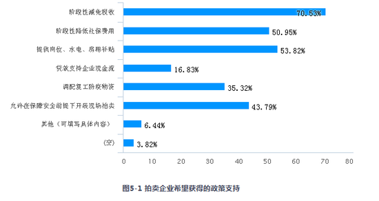 調(diào)研顯示,針對(duì)疫情帶來的困難,企業(yè)最迫切希望獲得的政策支持是階段性減免稅收(70.53%)、提供崗位、水電、房租補(bǔ)貼(53.82%)、階段性降低社保費(fèi)用(50.95%),以及允許在保障安全前提下開展現(xiàn)場(chǎng)拍賣(43.79%)。