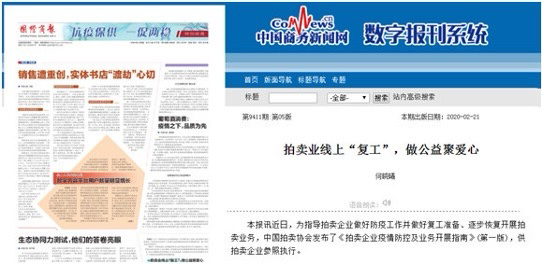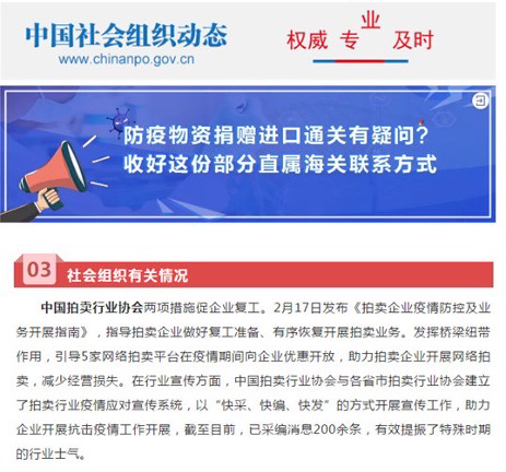 疫情發(fā)生以來,中拍協(xié)及各省市拍賣行業(yè)協(xié)會及時建立拍賣行業(yè)疫情應對宣傳系統(tǒng)。各行業(yè)協(xié)會發(fā)揮靠近企業(yè),反應迅速的優(yōu)勢,積極組織企業(yè)開展抗擊疫情和慈善公益活動,展現了行業(yè)積極向上的精神力量。民政部“中國社會組織”公號兩次發(fā)消息介紹中國拍賣行業(yè)抗擊疫情情況;商務部國際商報多次報道行業(yè)抗擊疫情和慈善義拍情況。