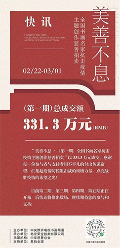 3月1日,“美善不息,全國書畫名家抗擊疫情主題創(chuàng)作慈善拍賣”網(wǎng)上結(jié)拍,第一期成交331萬元。日前,1-3期總計成交545.7萬元。本次慈善拍賣由中央數(shù)字電視書畫頻道主辦,北京榮寶拍賣有限公司承辦,易拍全球(北京)科貿(mào)有限公司支持,全部善款以藝術(shù)家名義通過中華慈善總會公開捐贈,由中華慈善總會為藝術(shù)家頒發(fā)捐贈證書,為慈善買家頒發(fā)愛心證書,所有涉及捐贈信息將按照規(guī)定對社會公開,接受全民監(jiān)督。此次慈善網(wǎng)拍參與藝術(shù)家眾多,后續(xù)還將推出數(shù)場,所有拍品均不設(shè)保留價并免除委托方傭金。