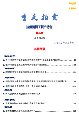 重慶市拍賣行業(yè)協(xié)會專門制作《抗疫情復工復產特刊》,收集匯總復工復產相關政策資訊,在重慶當?shù)嘏馁u企業(yè)間進行分享,方便拍賣企業(yè)了解最新政策,引導拍賣企業(yè)復工復產。
