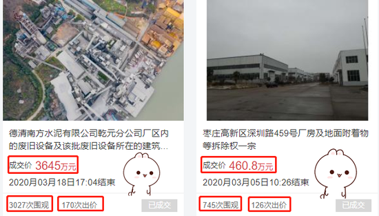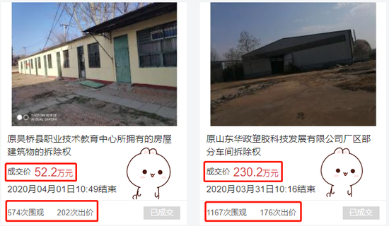 翻閱中拍平臺線上成交的拆除權(quán)拍賣,并不在少數(shù),而且成交結(jié)果也讓人眼前一亮!如下圖所示,近期在中拍平臺成交的拆除權(quán)。在成交價格、圍觀次數(shù)還有競價次數(shù)上來看,都說明了其受市場的歡迎程度。拍賣確實也為拆除權(quán)的處置提供了更多可能性!網(wǎng)絡(luò)拍賣不僅讓拆除權(quán)拍賣變得更加便捷,還能吸引到全國買家的參與!
